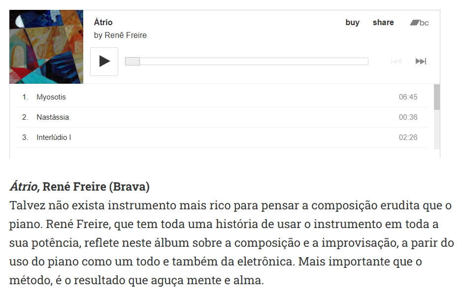 Talvez não exista instrumento mais rico para pensar a composição erudita que o piano. René Freire, que tem toda uma história de usar o instrumento em toda a sua potência, reflete neste álbum sobre a composição e a improvisação, a parir do uso do piano como um todo e também da eletrônica. Mais importante que o método, é o resultado que aguça mente e alma.