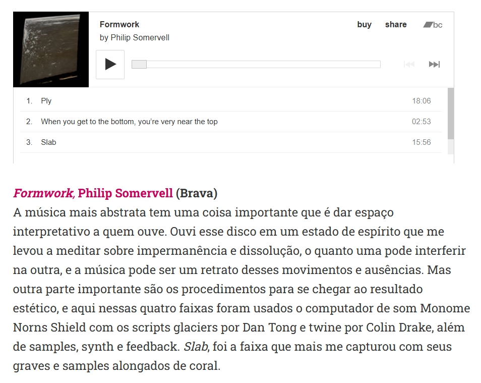 A música mais abstrata tem uma coisa importante que é dar espaço interpretativo a quem ouve. Ouvi esse disco em um estado de espírito que me levou a meditar sobre impermanência e dissolução, o quanto uma pode interferir na outra, e a música pode ser um retrato desses movimentos e ausências. Mas outra parte importante são os procedimentos para se chegar ao resultado estético, e aqui nessas quatro faixas foram usados o computador de som Monome Norns Shield com os scripts glaciers por Dan Tong e twine por Colin Drake, além de samples, synth e feedback. Slab, foi a faixa que mais me capturou com seus graves e samples alongados de coral.