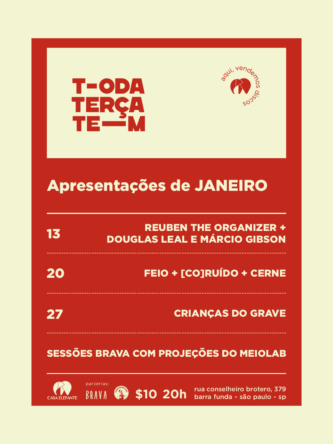 E agora a Brava entra também como parceira, após ter produzido algumas sessões ao longo de 2025, e segue trazendo artistas e grupos mais voltados à musica de improvisação, de ruído, experimental e não comercial para a Casa Elefante, além de colaborar na produção de todas as terças, que se propõem a ser um espaço de diálogo aberto entre as mais variadas estéticas sonoras e interseção de seus públicos.